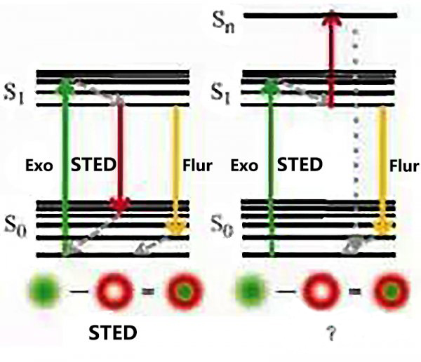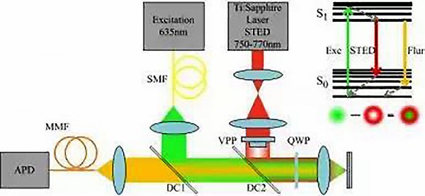 STED,全名是Stimulated Emission Depletion,受激輻射光淬滅。如下圖所示STED系統結構示意圖,在右上角,有—副能級圖。其中,你看到紅色的箭頭和黃色的箭頭了嗎?