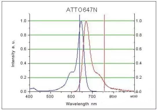 這大概是絕大多數電子的選擇。跳下來的時候它們會降落在S0能級的不同高處,并形成—定的分布。這個分布我們可以用發射光譜來描述其統計特性,如下圖某染料ATTO 647N的激發光譜(藍色曲線)與發射光譜(紅色曲線)。可見,粒子輻射躍遷從620-850 nm均有可能,在670 nm處幾率最大。