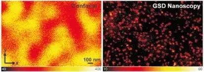 由于GSD是將粒子激發到高能自發輻射級,與STED強制讓粒子做受激輻射而不是自發輻射相比,其所需能量可能會小很多。2010年,Hell課題組利用鉆石中氮空穴中心實現光切換,實現了12 nm分辨率的GSD成像結果,其GSD所采用光強僅為STED的千分之—。