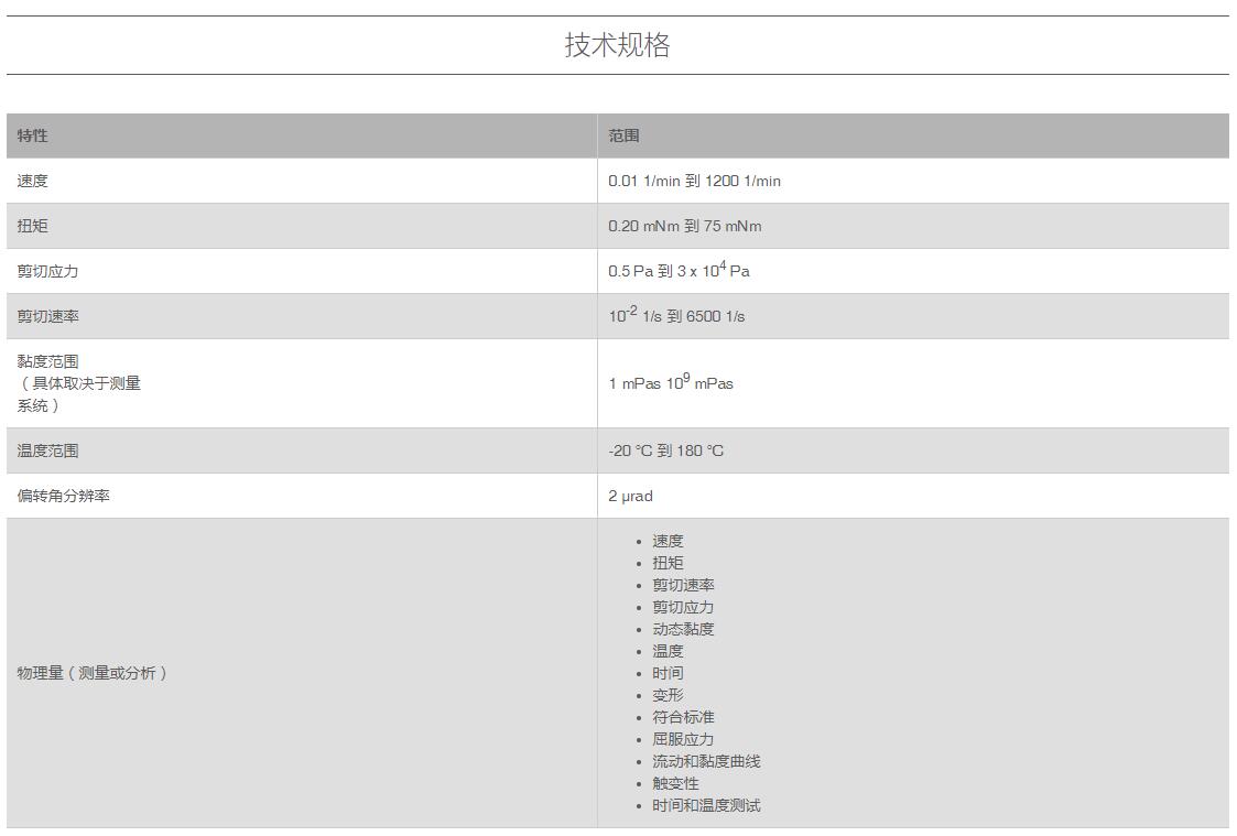 >同心圓筒測量系統(tǒng)(符合 DIN EN ISO 3219 和 DIN 53019 標準):適用于粘性液體至粘彈性液體(從低黏度樣品至半固體樣品,例如乳膏)>雙間隙測量系統(tǒng)(符合 DIN 54453 標準):適用于低黏度樣品(<100 mPa.s)